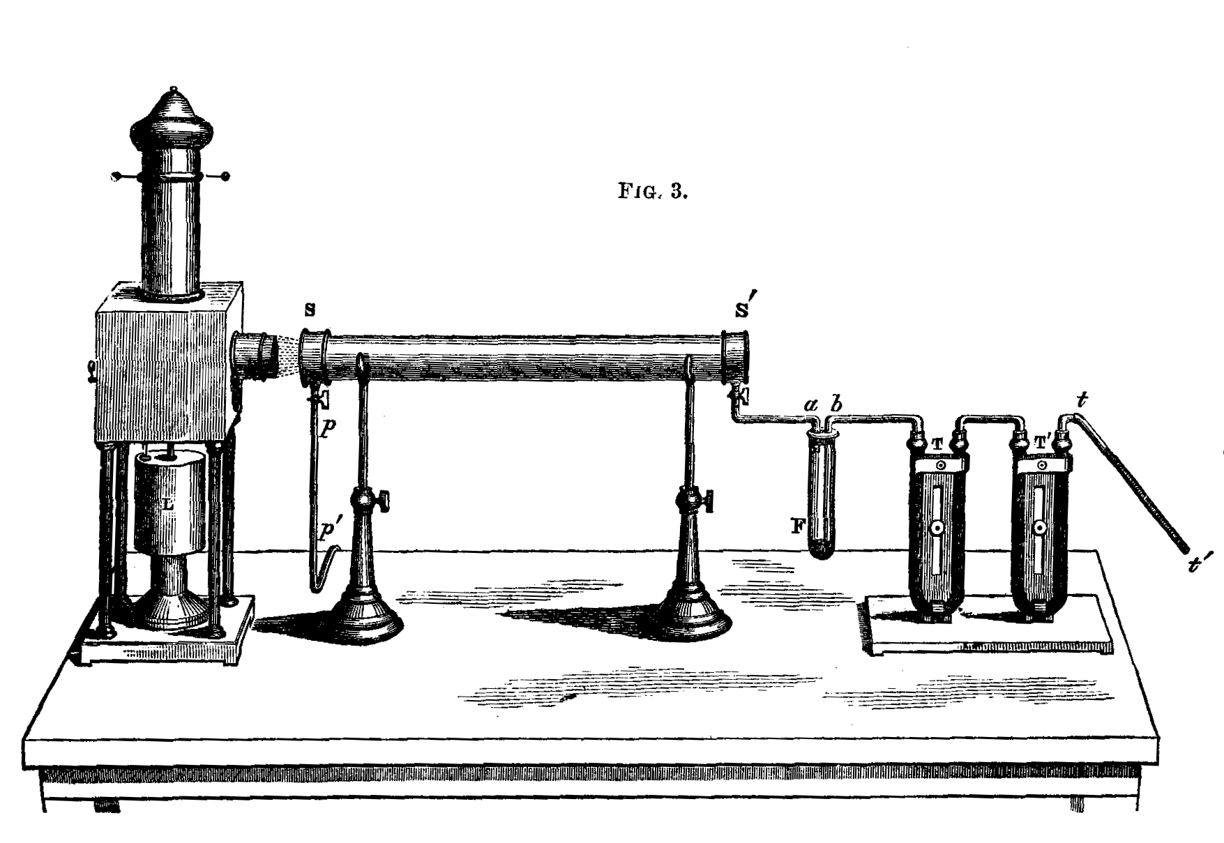 “L represents the electric lamp, s s’ the experimental tube, pp’ the pipe leading to the air-pump, and F the test-tube containing the volatile liquid. The tube t t’ is plugged with cotton-wool intended to intercept the floating matter of the air; the bent tube T’ contains caustic potash, the tube T sulphuric acid, the one intended to remove the carbonic acid and the other the aqueous vapour of the air.” — Fragments of Science, Volume One by John Tyndall