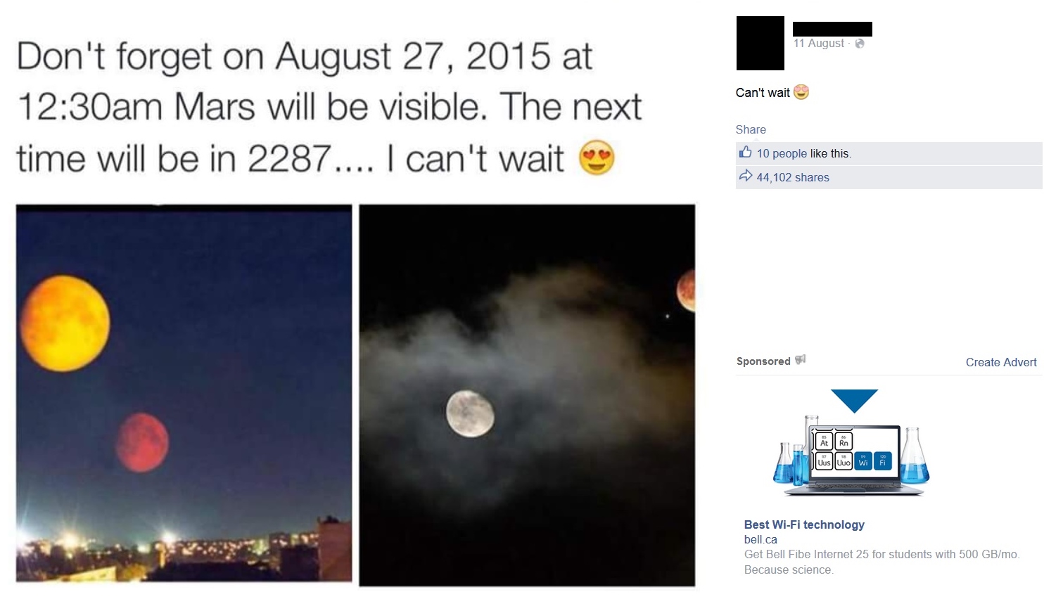 I am writing this post to being awareness to a recurrent Mars hoax that keeps resurfacing every year on social media. Today, I came upon this Facebook post which was shared more than 40,000 times.